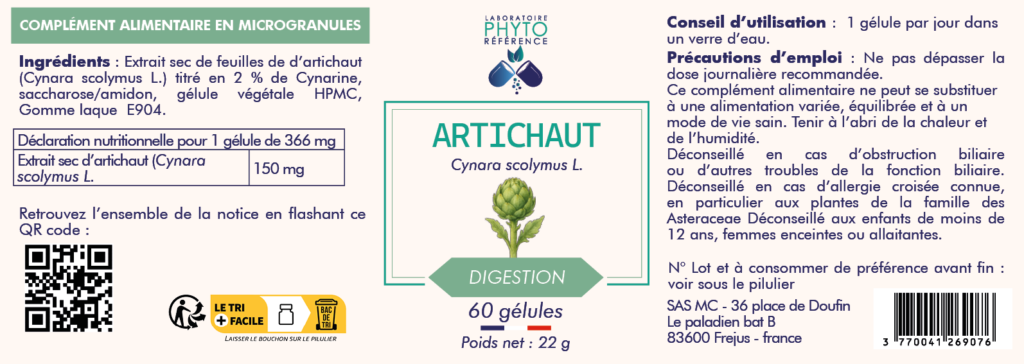 L’Artichaut 150 mg est un complément alimentaire à base d’extrait sec de feuilles d’artichaut (Cynara scolymus L.).