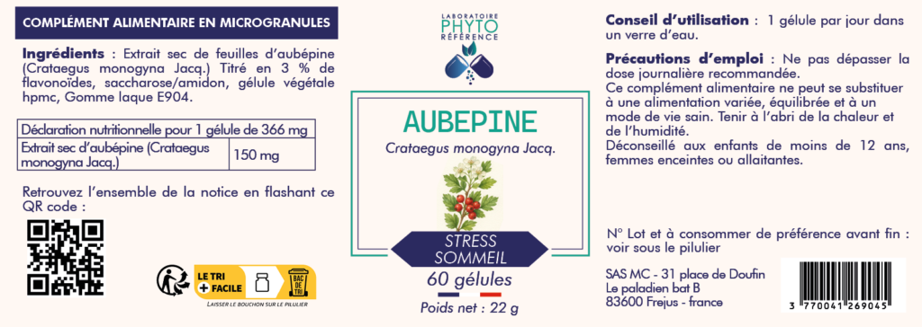 L’Aubépine 150 mg est un complément alimentaire à base d’extrait sec de feuilles d’aubépine (Crataegus monogyna Jacq.).