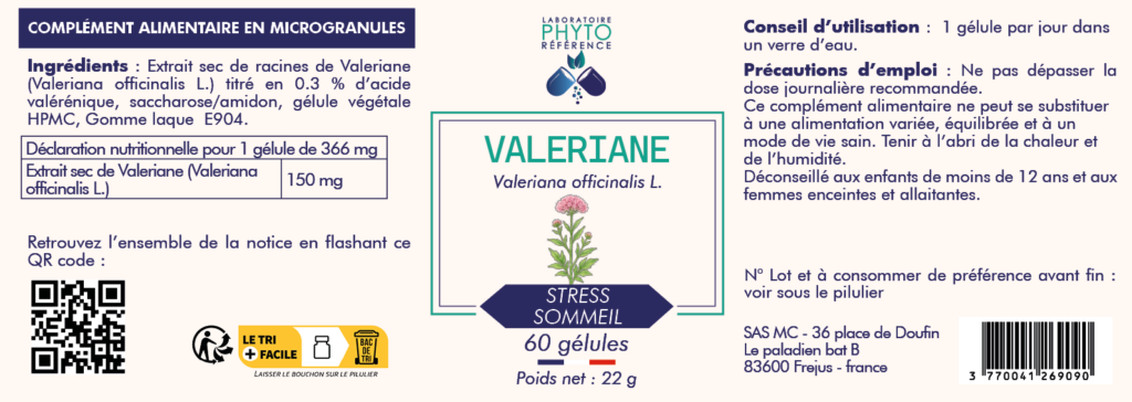 L’extrait est standardisé avec un traceur “Acide valérinique : 0,3 %”, garantissant une teneur constante en composés marqueurs.
